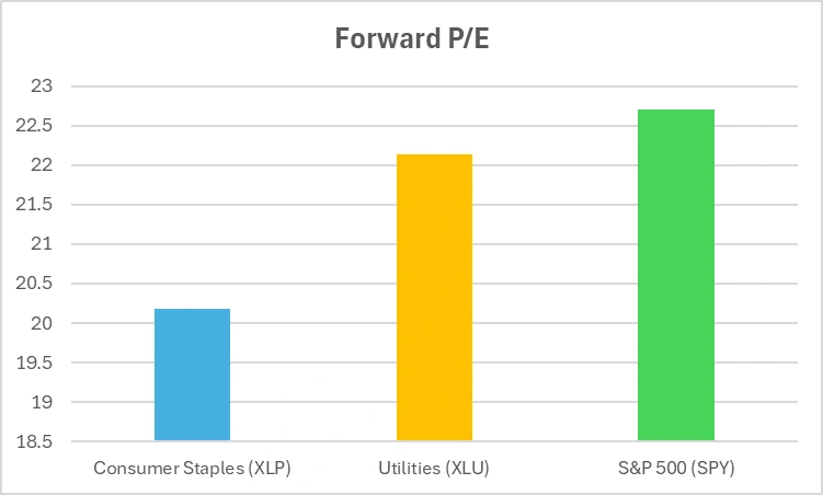 밸류에이션 점검: 방어적 섹터는 현재 전체 시장과 비슷한 선행 PER 수준에서 거래되고 있습니다. 투자자들은 ‘안정성’에 대해 과도한 비용을 지불하고 있는 걸까?