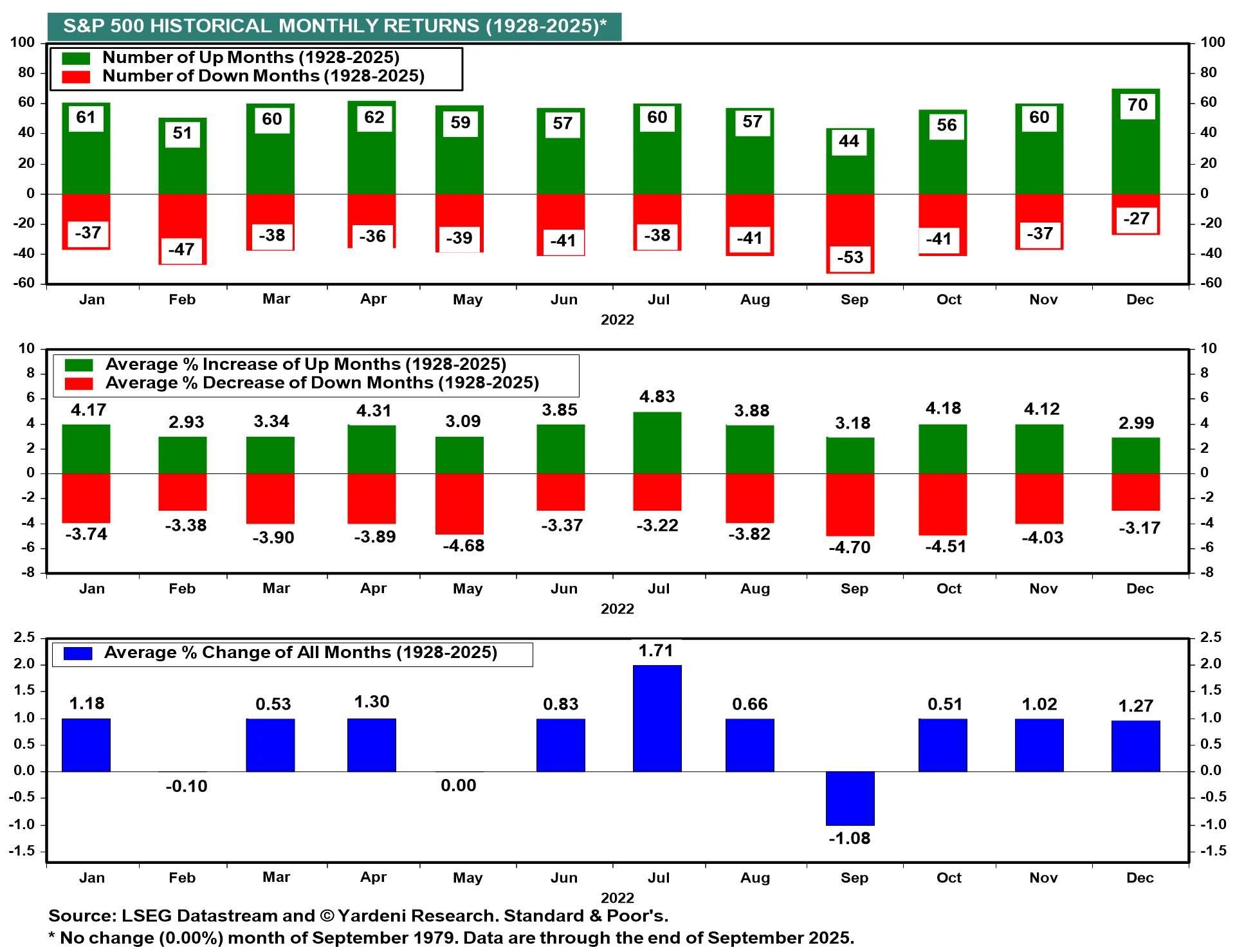 약 한 세기의 데이터(1928–2025)에 따르면, 11월은 S&P 500에서 가장 꾸준히 상승한 달 중 하나다 — 상승 60회, 하락 37회. 평균 상승률(+4.12%)은 7월 다음으로 높다. 하지만 과거는 미래를 보장하지 않는다.